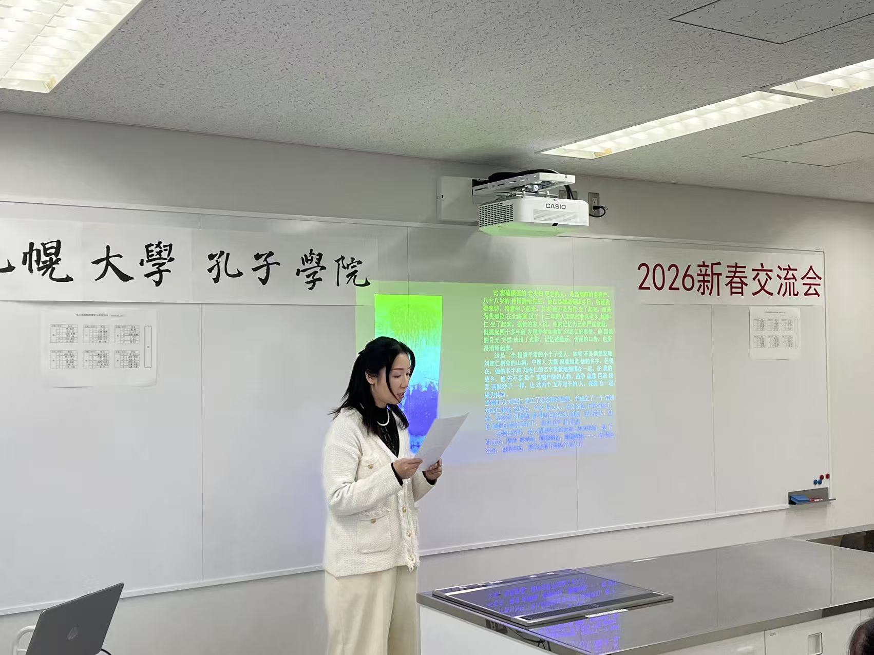 第1部では、札幌大学孔子学院中国語講座の受講生の皆さまによる発表が行われました。五十嵐さんによる「中国語の自己紹介」、安田さんによる「古詩の朗読」、小椋さんによる「漢詩の朗読および漢詩文化の紹介」、江藤さんおよび中国語学習者の永沼さんによる「中国語の朗読」が披露されました。