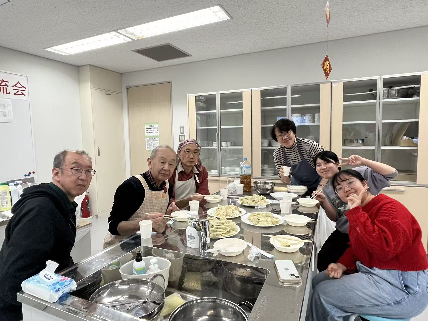 第2部では、大学の調理実習室にて「餃子パーティー」を開催しました。参加者全員で手作りの餃子を味わいながら、和やかな雰囲気の中で交流を深めました。